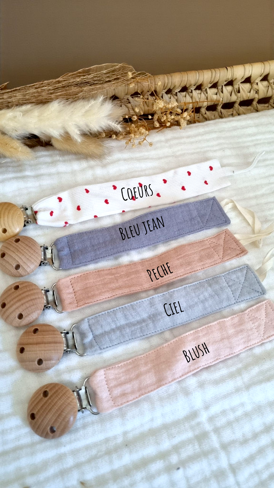 Cette attache Tétine est agréable au toucher grâce à ce joli tissu en gaze de coton, elle dispose d'un fermoir en bois composé de trois trous de ventilation pour plus de sécurité.